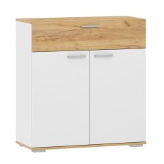 Прихожая «Кармен-7Н» имеет всё необходимое, чтобы заменить полноценную прихожую. Слева – элегантное зеркало и открытая секция с закруглёнными угловыми полками. Справа располагается вместительный отдел с глухой дверцей, под которым предусмотрена открытая ниша с полкой, где можно хранить обувь или сумки. Центральную часть занимают открытая вешалка с тремя металлическими крючками и небольшая тумба с распашной створкой. Вверху предусмотрена зона для головных уборов, опирающаяся на короткую хромированную трубу.